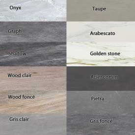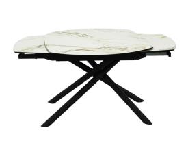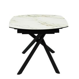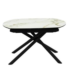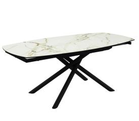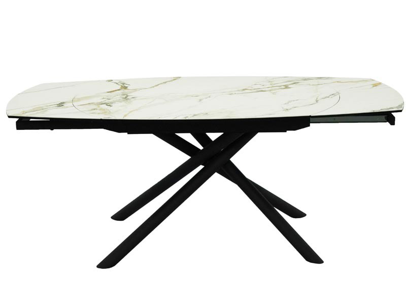 Vous désirez un intérieur unique et moderne, découvrez dans notre gamme de mobilier la table repas GLORIA Golden Stone. Pieds en métal laqué époxy noir, dessus et 2 allonges en verre recouvert de céramique 3mm Golden Stone KL188. Ouverture par rotation.