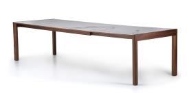 Dasras Design. Voisin Guillemin Dimensions : l 140/.../310 x h 75 x p 100 cm Plateau bois ou céramique Pour la collection Rive, les idées du studio se sont naturellement orientées vers la mise en valeur du travail du bois, notamment au niveau de la structure et du piètement de la table. L’un des principaux défis techniques ; les assemblages à la fois subtils et complexes entre les pieds et la traverse, qui se fondent harmonieusement à chaque bout de table. C’est un élément clé dans le design de la collection, il apporte une cohérence esthétique tout en garantissant la solidité nécessaire à la structure. Autre challenge ; maintenir une continuité de niveaux entre les traverses et le plateau. La précision de ces assemblages a été cruciale pour préserver l’équilibre entre élégance visuelle et robustesse fonctionnelle. Pour la version extensible, il a fallu concilier le poids de la structure en bois massif avec la nécessité de rendre le système de déploiement des allonges facile et intuitif. Un défi double : garantir la stabilité de la table tout en permettant une manipulation aisée et fluide des allonges. Cela a nécessité une réflexion minutieuse sur les mécanismes d’extension, afin que chaque table offre une expérience utilisateur pratique et un design soigné. Disponible en chêne et noyer us Piètements et traverses en bois massif Version dessus bois : plaqué façon massif 9/10e sur mdf de 22 mm avec alèses en bois massif Version dessus céramique : plateau de céramique 6 mm collée sur panneau multiplis de 16 mm avec alèses en bois massif 2 allonges de service de 50 cm rangées dans la table, composées avec la même matière que le plateau. Ouverture en bout de table CCA (coulisses aluminium) table extensible