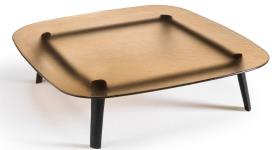 table basse avec plateau en verre en fusion de 12 mm trempé, verni dessous avec des teintes semi-transparentes ou métallisées. Structure en bois massif disponible dans les finitions Tabac ou thermotraité noir.