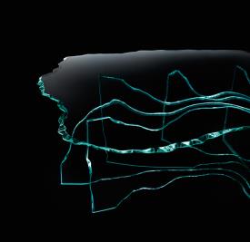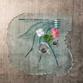 Design. Danny Lane Dimensions : l 125 x h 40 x p 125 cm table basse avec plateau en verre de 15 mm sculpté à la main. Piètement en verre cintré de 12 mm. Détails métalliques en acier inox