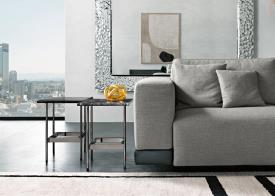Table basse avec plateau en DV-GLASS® de 23 mm transparent, avec bandes colorées ou avec le plateau en marbre. Base en métal, finition Titane opaque ou Nickel noir brillant.