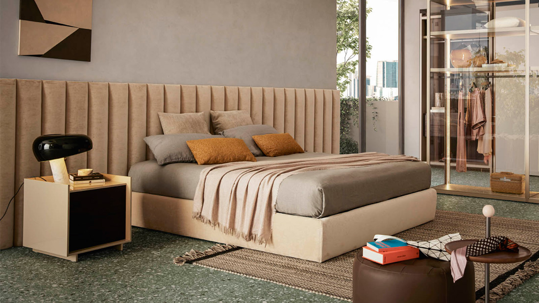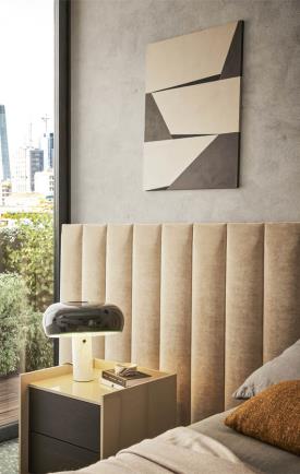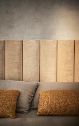 Élégance et raffinement. Des surfaces uniques, douces, chaleureuses et accueillantes. Des panneaux muraux composés de lamelles modulaires capitonnées, effilées à leurs extrémités pour une touche design et stylée. L'éclairage périmétral, en option, accentue l'effet visuel de ces panneaux, les sublimant et faisant du lit la pièce maîtresse : unique, raffiné et majestueux. L'association avec des panneaux muraux en bois lisse ou laqués est possible, pour un dynamisme compositionnel et textural accru.