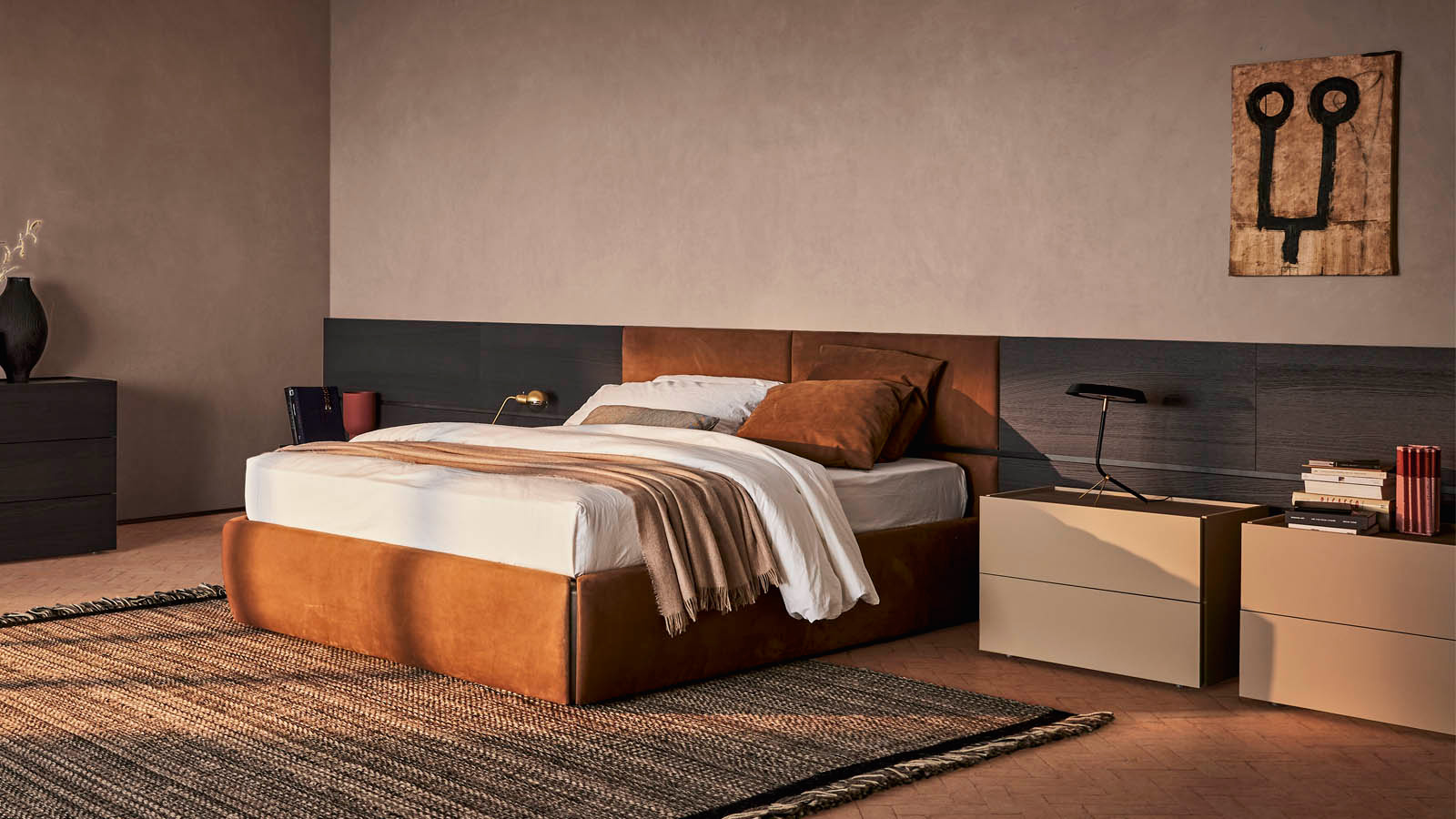 La créativité et les goûts personnels peuvent s'exprimer pleinement. Aménager une chambre, c'est composer des surfaces et choisir leurs caractéristiques grâce à un système de panneaux modulaires en bois. Disponibles en finition laquée mate ou brillante, douce au toucher, en bois, avec des finitions texturées, plaqués pierre, capitonnés ou revêtus de tissu ou de cuir, nos panneaux peuvent être équipés d'un éclairage arrière et d'entretoises aux finitions métalliques, laquées ou bois. Ils s'harmonisent avec tous les lits plateformes Pianca et s'intègrent à d'autres modules tels que des étagères et des rangements.