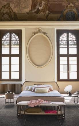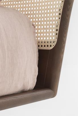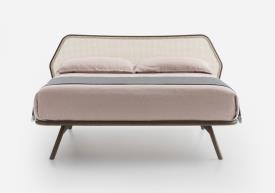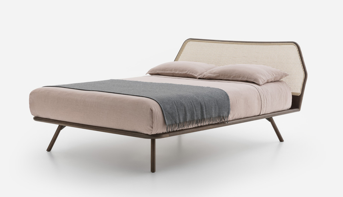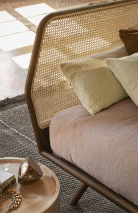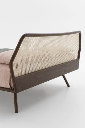 Le minimalisme révèle un caractère inattendu. Réinterprétation moderne du lit classique à quatre pieds, Trama arbore un design épuré aux lignes claires et lisibles. La tête de lit en rotin tressé se distingue comme un élément raffiné et recherché, notamment grâce à la structure hexagonale de son profil. La robustesse et la beauté naturelle du bois massif, choisi pour l'ensemble de la structure, sont sublimées par le travail artisanal et le profil continu et dynamique du cadre et de la tête de lit.