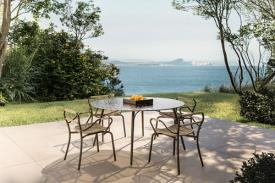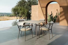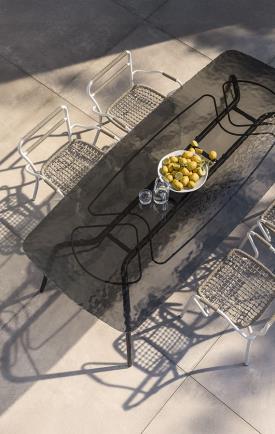 Spacieuse et polyvalente, la table rectangulaire classique Eolo, à quatre pieds, est idéale pour les repas en plein air. Toutes deux possèdent une structure en tube d'acier inoxydable, un matériau durable qui garantit leur stabilité. Le plateau en grès cérame, disponible en trois coloris, présente des angles arrondis et lisses, reflétant le concept de design qui imprègne toute la collection d'extérieur avec ses courbes douces. Les pieds de la table, légèrement évasés, sont disponibles en finition laquée Espresso ou Seta.