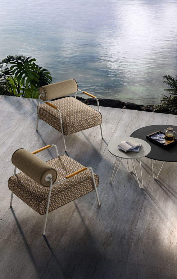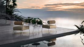 Ses atouts : un passepoil sur les bords des housses entièrement déhoussables et un dossier à coussin enrouleur, parfois repositionnable. Fabriquée avec un rembourrage en polyuréthane respirant, drainant et résistant aux intempéries, spécialement conçu pour le mobilier d'extérieur. La structure tubulaire en acier inoxydable est disponible en finition brossée ou dans les coloris Espresso et Seta. Dans le respect des principes de l'économie circulaire et du développement durable, tous les éléments de la collection sont facilement démontables.
