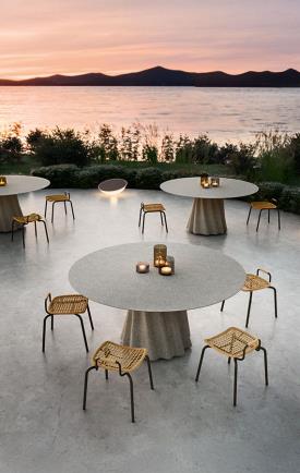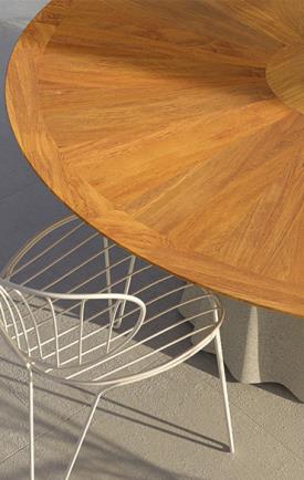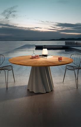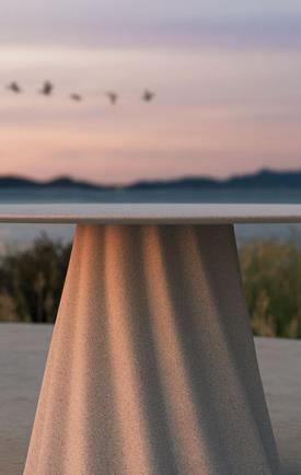 Les lignes uniques et évocatrices de la table Onda rappellent les ondulations naturelles de la mer. Fruit d'une démarche créative explorant de nouvelles combinaisons de textures et de nouvelles possibilités formelles, la table arbore un design sculptural et tridimensionnel. Son piètement est un bloc massif de béton léger, un matériau de haute technicité associant fibres organiques et fines particules minérales. Sa composition particulière lui confère des performances exceptionnelles, telles qu'une résistance hors pair et une durabilité inégalée. Deux plateaux sont proposés : en ciment ou en bois d'iroko, plus chaleureux, orné d'une superbe marqueterie.