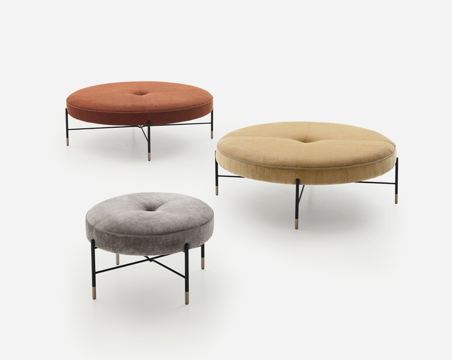Design. Pier Luigi Frighetto Dimensions : Ø 60/110 x h 35 cm La collection est complétée par un pouf rond, disponible en deux tailles, avec un coussin bordé de cuir gros grain.