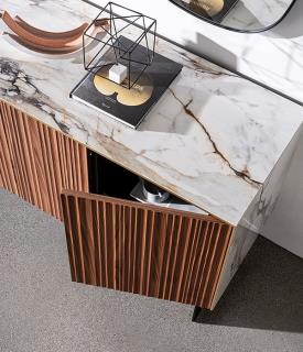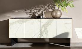 Soutenue par deux lames métalliques, Kala est une nouvelle collection de buffets qui apporte raffinement et élégance à tous les espaces. Parmi les différentes options disponibles, on trouve les nouvelles portes en bois texturé cannelé, une finition aux rainures verticales qui confère un aspect tridimensionnel distinctif.