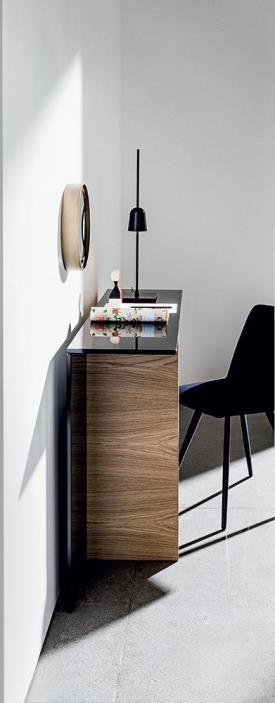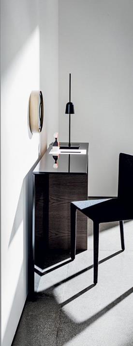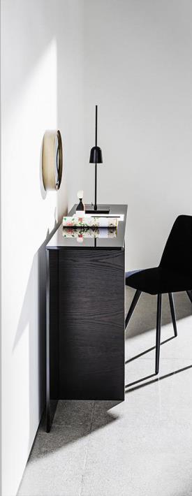 Design. Lievore Altherr Molina Dimensions : l 130 x h 85 x p 36 cm Console avec plateau en verre feuilleté fumé. Base composée d'un élément en bois, différentes finitions, et un élément en verre laqué noir.