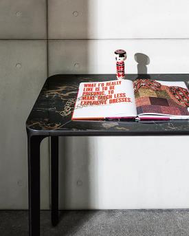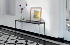 Console avec quatre pieds en aluminium moulé sous pression, finition chromée polie ou laquée, différentes finitions, et anodisée ou laquée, différentes finitions, profil de structure en aluminium. Plateau disponible en verre trempé laqué ou dépoli laqué ép. 8 mm, différentes couleurs, ou en Materia ou céramique, différentes finitions. Le plateau en bois est disponible dans la version à quatre pieds.