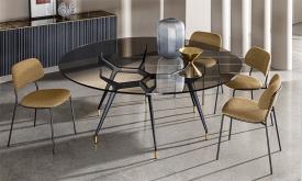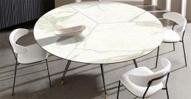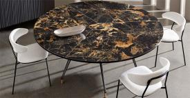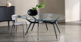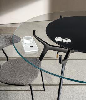 Grande table avec pieds en aluminium laqué et traverse de liaison, disponible en plusieurs finitions. Plateaux disponibles en différentes dimensions, matériaux et finitions. En option : plateau tournant disponible en différents matériaux et finitions.