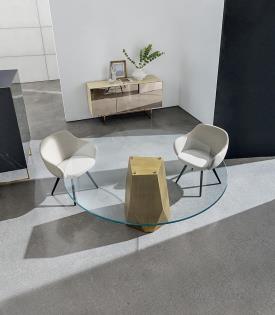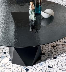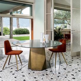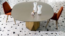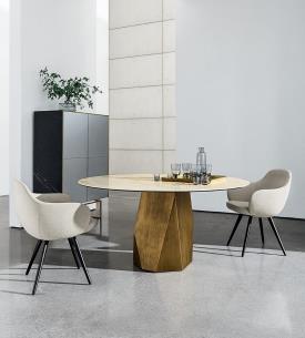 Une nouvelle table où formes et matériaux se mettent en valeur dans un équilibre géométrique naturel grâce à un piètement iconique inspiré des lignes sculptées caractéristiques des Dolomites.