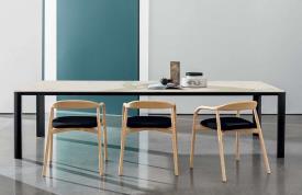 Table avec piètement et structure en aluminium peint, disponible en plusieurs finitions. Plateau en verre laqué ou dépoli de 8 mm d'épaisseur, disponible en plusieurs coloris. Également disponible avec un plateau en céramique, proposé en plusieurs finitions.