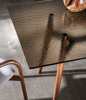 Elle est dotée d'une traverse en aluminium et de pieds en bois, disponibles en différentes finitions. Le plateau est proposé en diverses dimensions, matières et finitions.