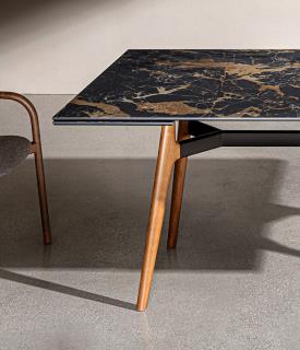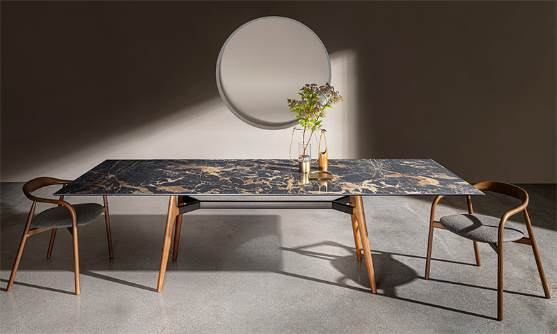 Table extensible avec traverse en aluminium et pieds en frêne : finition naturelle, noyer ou laque noire à pores ouverts. Plateau en verre trempé ou en céramique multicouche, disponible en plusieurs dimensions et finitions. Structure extensible peinte en noir.
