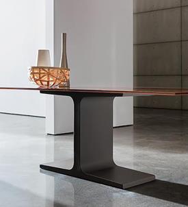 Table avec piètement en acier inoxydable satiné, en métal laqué (différentes finitions) ou bruni. Plateau en verre trempé laqué, en bois ou en céramique (différentes finitions).