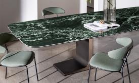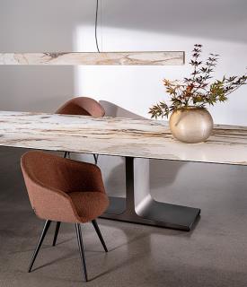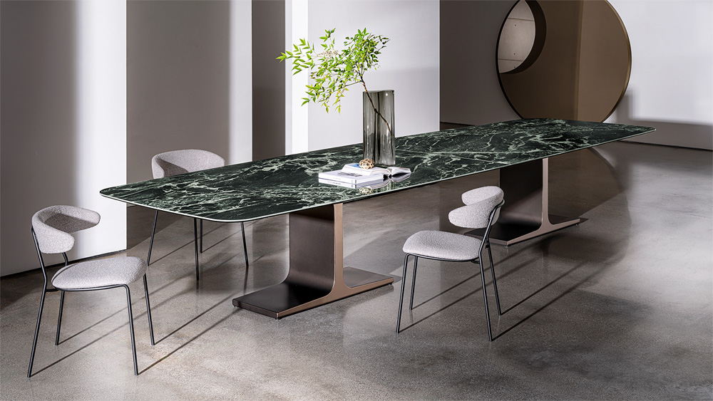 table avec double piètement en métal peint, disponible en plusieurs finitions. Le plateau, composé de deux parties, est proposé en différentes dimensions, matériaux et finitions. Dimensions sur mesure disponibles sur demande.