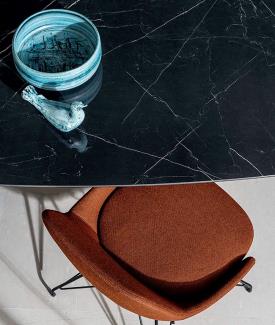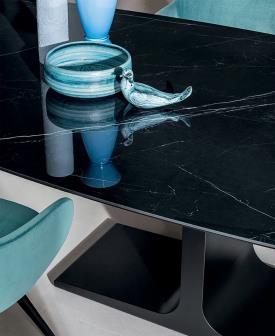 Table avec piètement en acier inoxydable satiné, en métal laqué (différentes finitions) ou bruni. Plateau en verre trempé laqué, en bois ou en céramique (différentes finitions).