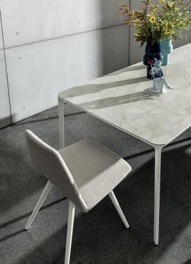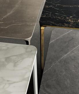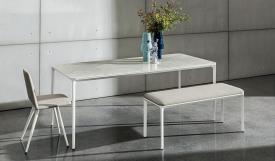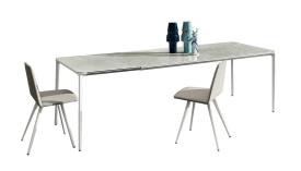 Table extensible avec pieds en aluminium moulé sous pression, chromés polis ou peints (différentes finitions), et structure en aluminium anodisé ou peint (différentes finitions). Plateau disponible en verre trempé de 8 mm d'épaisseur, laqué ou laqué dépoli, en bois, en céramique ou en stratifié haute pression (HPL). La version en bois est toujours fournie avec une rallonge en HPL noir.