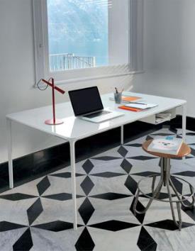 Table avec pieds en aluminium moulé sous pression chromé ou peint, finitions variées, et structure en aluminium anodisé ou peint, finitions variées. Plateau en verre trempé de 8 mm d'épaisseur, laqué ou laqué dépoli, coloris variés. Également disponible avec un plateau en bois, en céramique ou en stratifié haute pression (HPL), finitions variées. Porte-documents en aluminium laqué, coloris variés.
