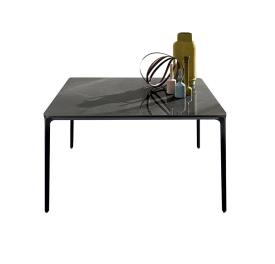 Table avec pieds en aluminium moulé sous pression chromé ou peint, disponibles en différentes finitions, et structure en aluminium anodisé ou peint, également disponible en différentes finitions. Plateau en verre trempé de 8 mm d'épaisseur, laqué ou laqué dépoli, disponible en différentes couleurs. Également disponible avec un plateau en MATERIA, céramique, bois ou HPL, proposé en différentes finitions.