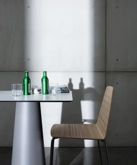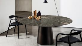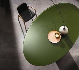 Un piètement en acier inoxydable ou en métal laqué s'associe à un plateau en verre, en bois, en céramique ou en Materia pour créer une famille de tables aussi riches en personnalité qu'adaptées à différents environnements : des intérieurs domestiques aux espaces professionnels.