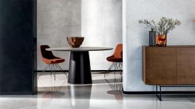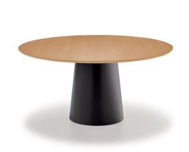 Table ronde moderne avec un piètement en acier inoxydable satiné ou en métal laqué, disponible en plusieurs finitions. Le plateau est en contreplaqué de bouleau finlandais de 26 mm d'épaisseur, avec un chant en biseau à 45°, disponible en placage noyer ou chêne, également disponible en plusieurs finitions.